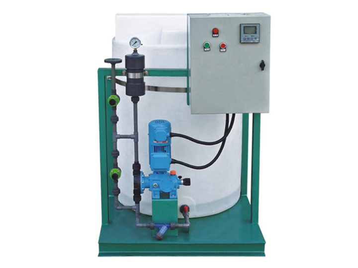 本装置主要包括药液溶配系统,计量投加系统、安全系统和控制系统等部分。固体药剂加入溶药箱内.然后按比例加入工业水搅拌溶解,由计量投加系统投加药点。投加控制可采用手动方式,也可依据上位系统输出的控制信号,进行随动控制,自动投加。
